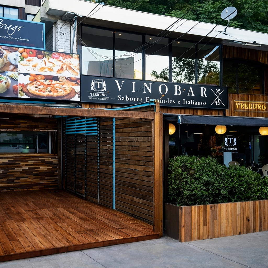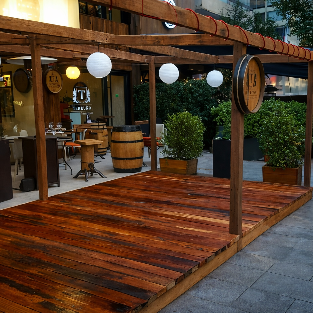 Este proyecto corresponde a la fabricación de una estructura de bar y terraza en madera nativa, construida completamente a medida para integrarse de forma armónica con su entorno urbano y comercial.