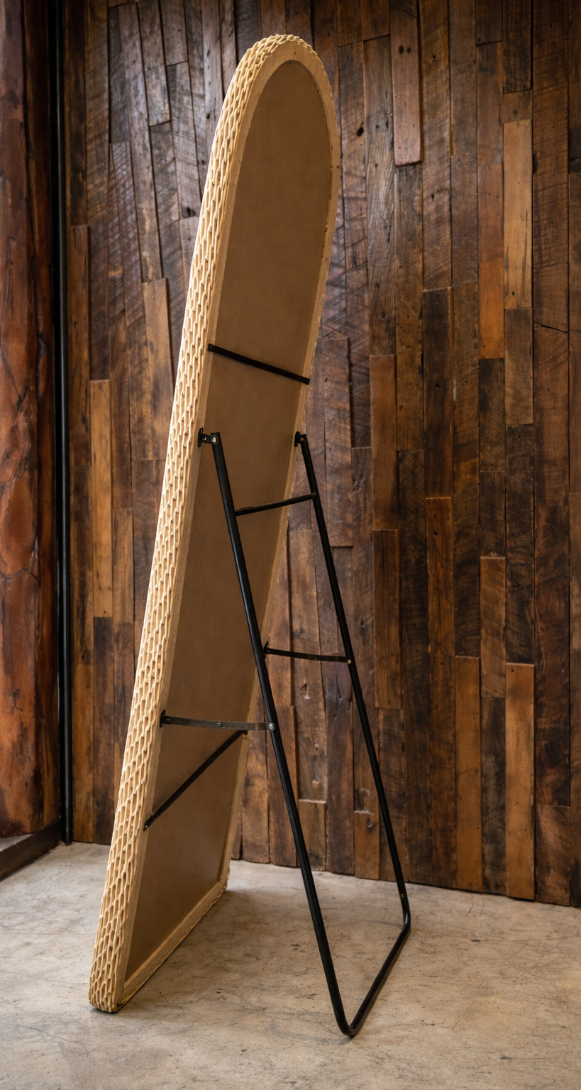 Espejo artesanal confeccionado en ratán tejido, que combina funcionalidad con estética natural. Su marco de fibra natural proporciona calidez y textura a cualquier espacio, complementando tanto estilos rústicos como contemporáneos.
